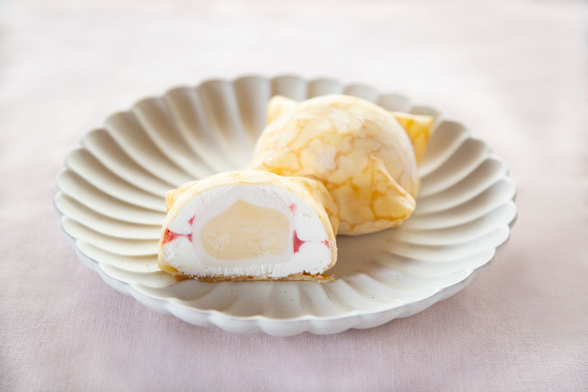 「もっちりとした大福」「甘すぎない生クリーム」「香ばしいクレープ生地」の食感の違うそれぞれの素材が組み合わさった新食感スイーツです。